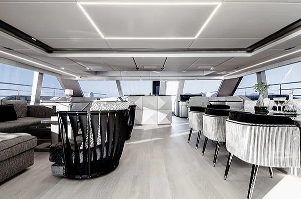 Fit-out quality and interior materials: Sunreef’s joinery is a key selling point. High-grade veneers, solid edge treatments on high-traffic corners, lightweight stone with honeycomb backing—these are cost multipliers. A restrained, well-lit interior using durable fabrics ages better than stark white minimalism that shows every wear mark.
